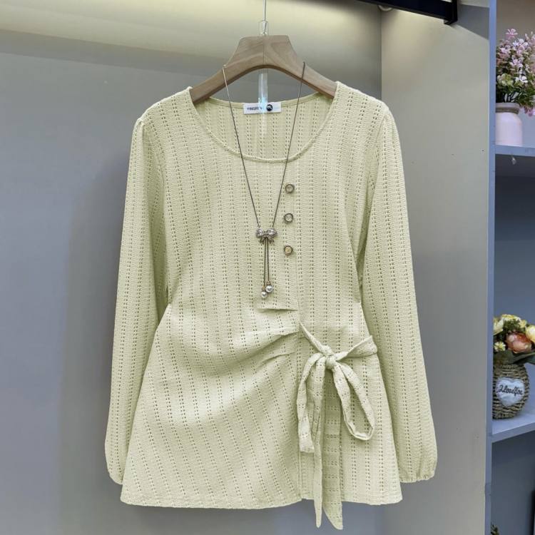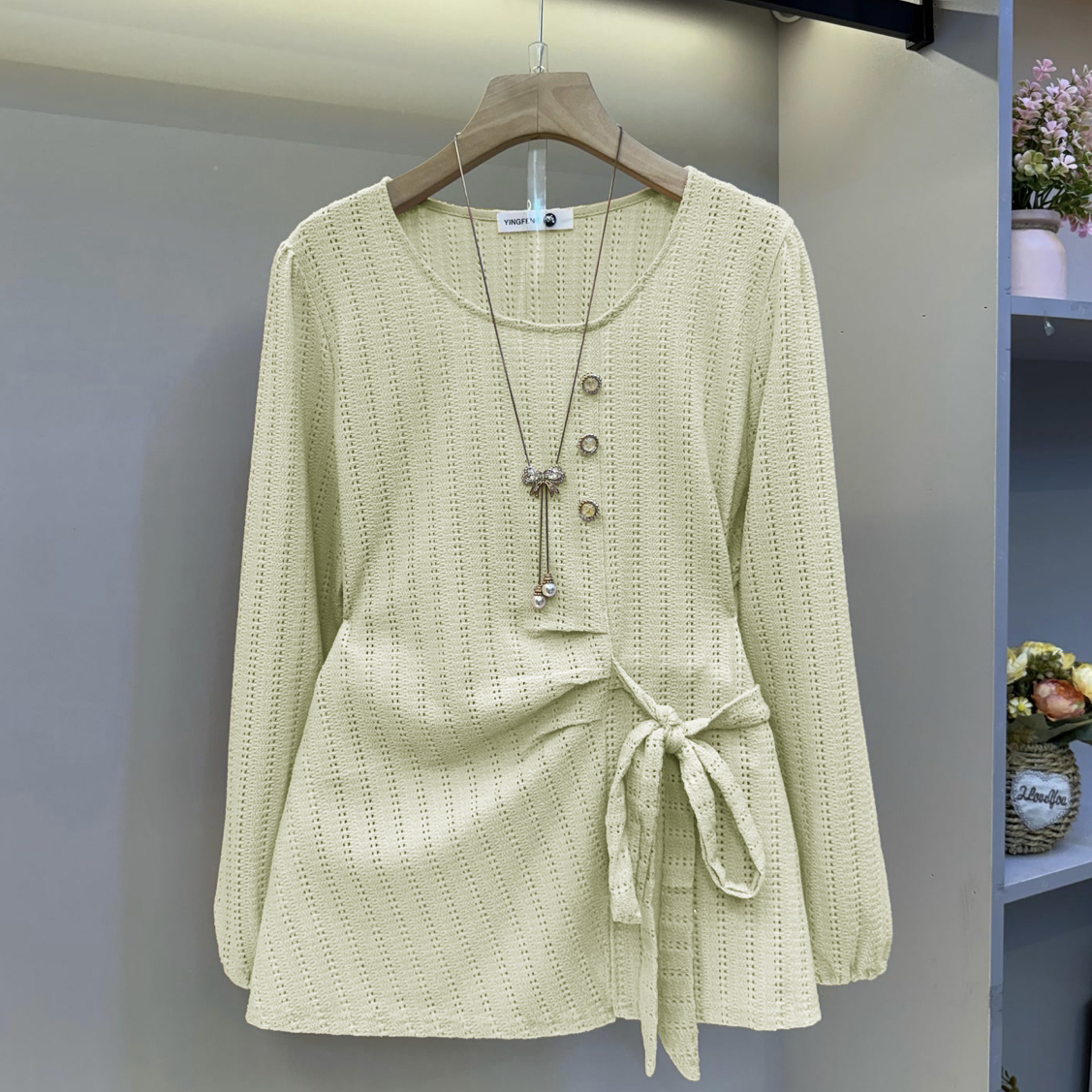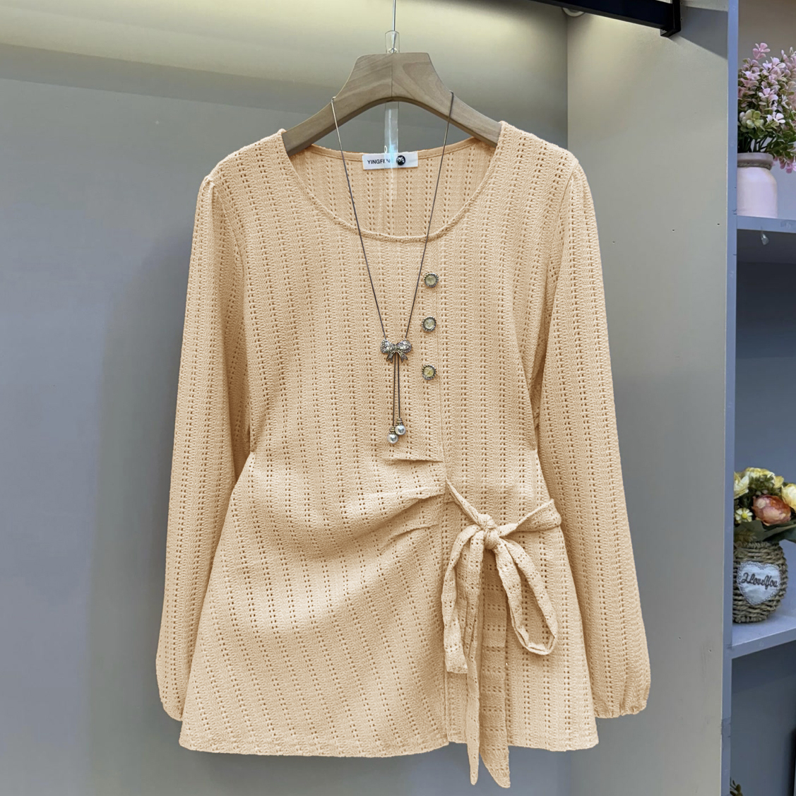 2025新款時尚名媛溫柔風圓領掐褶收腰蝴蝶結減齡百搭長袖