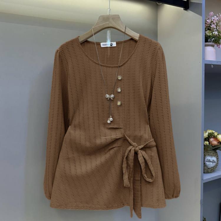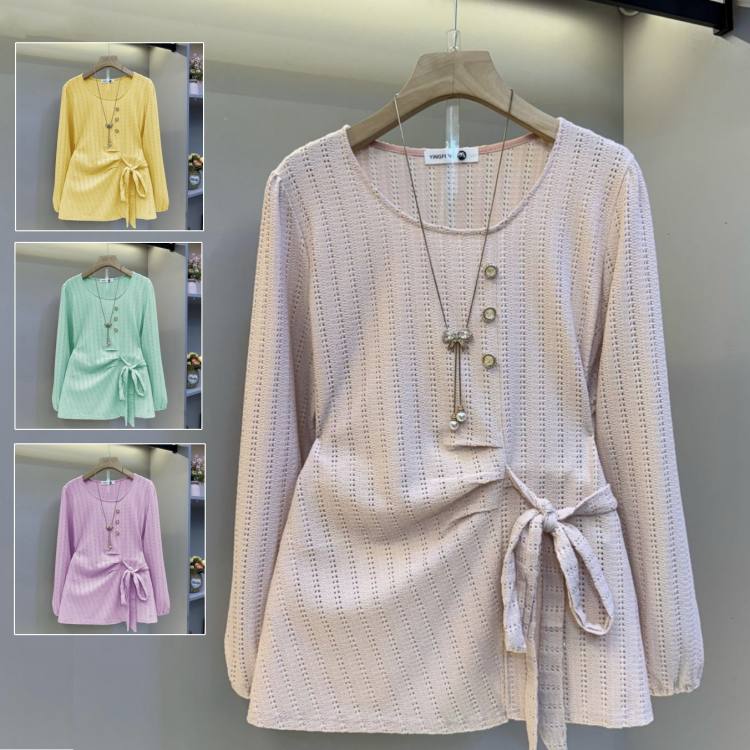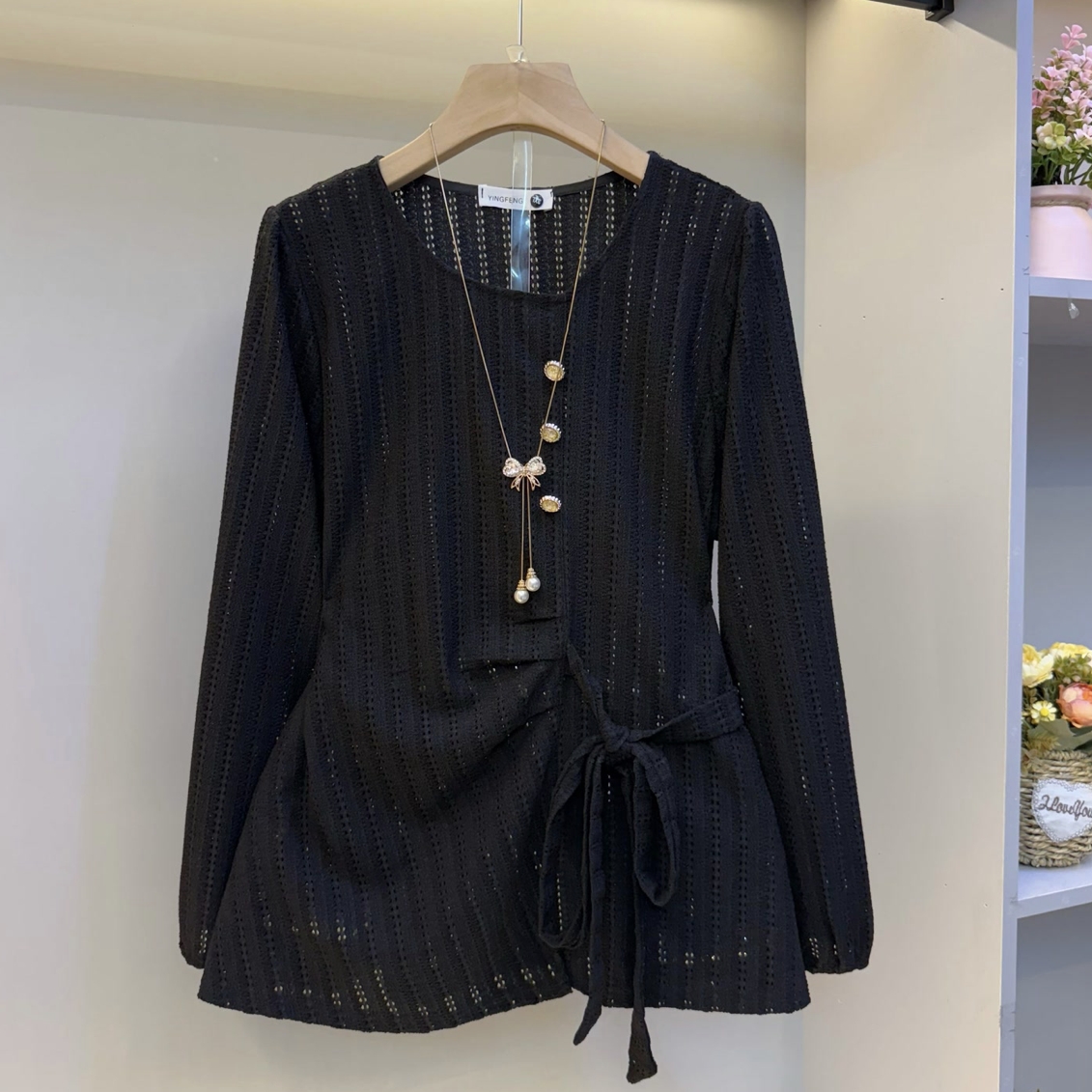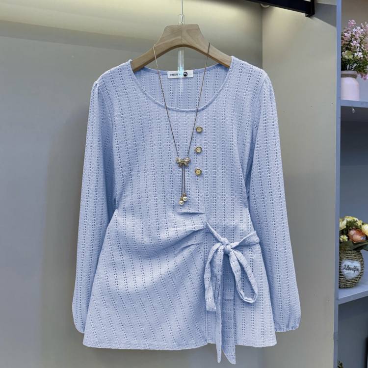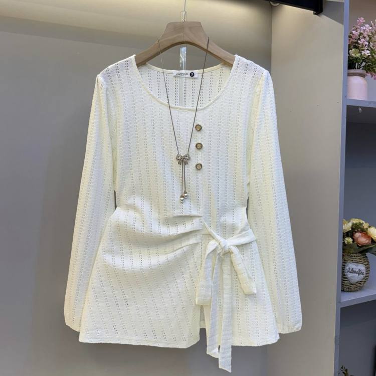 2025新款時尚名媛溫柔風圓領掐褶收腰蝴蝶結減齡百搭長袖
